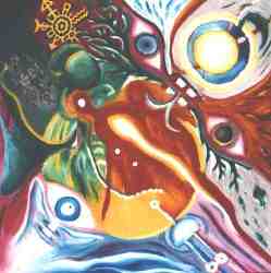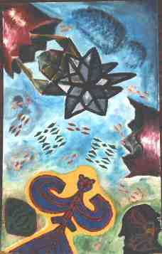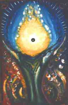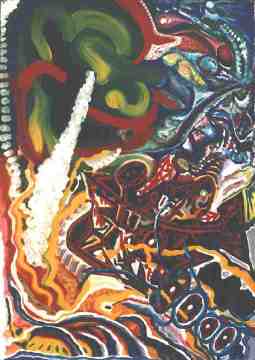 4.4.1999 „Firebird“ von Agnes, Carola, Martin und Wolfgang Im Vordergund tobt das Leben mit seinen wilden Elementen und Energien. Im Hintergrund sehen wir die ewigen Schaltstrukturen des kosmischen Bewußtseins in gleichzeitig kabbalistischer, magischer und logischer Ausformung. „Ich nenne es das Feuervogel- und Assura-Bild. In der Mitte ist ein weißes Spermatozon in einem roten Feuerschlund. Das Spermatozon ist die züngelnde Zunge des Assuras. |