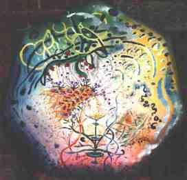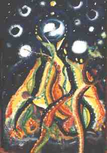 9.1.1999 „Big Z“ Carola und Martin Unser Bild ähnelt dem Sonne und Mond-Bild (Change). Martin malte Galaxien in der Schwärze des Kosmos, und Carola tantrische Netzach-Formen. |