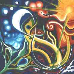 5.9.1998 „Change“ Ich habe eine Sonne, und Martin einen Mond gemalt. Von Agnes kamen die pflanzenähnlichen Formen. Quer über das Bild sind zwei inneinanderliegende Achten zu erkennen. |