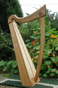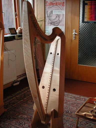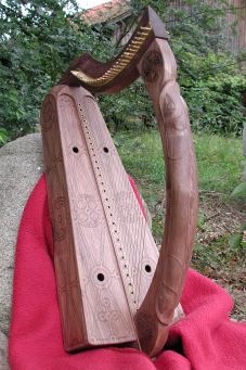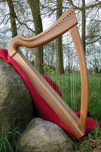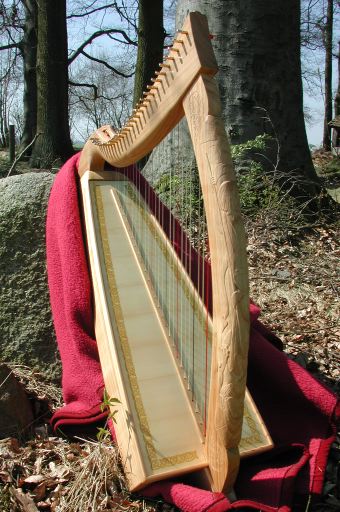 Clarsach "Queen Mary" The traditional harp with metal strings, complex carving, romanic and celtic fire painting. The construction corresponds to the historical way soundwise (body carved out of massive wooden block), but is assembled, to economise wood and make the instrument more afordable. 29 strings from A to a3 (also G-g3) bronze and silver also available with gold strings (plus Euro 800 April 2008), height 82cm as shown € 3935,--