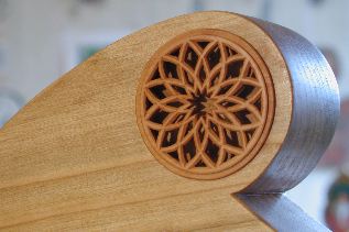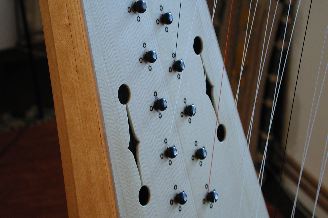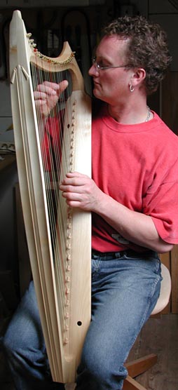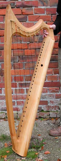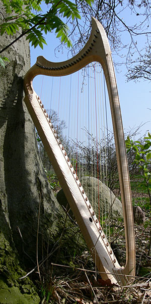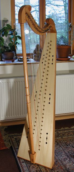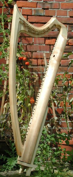 Gothic Harp "Oliver" The idea for this harp came in a peculiar way: After making a Dopia (a double harp with two rows of strings chromaticaly tuned), I was very impressed, that the corpus build in semihistorical way with vertical strained soundboard was coping with the tension of so many strings. The wish of the harper Oliver from Hamburg to own a light harp and my enthusiasm let me develope a plan i.e. a backbreeding (similar to the gallowy buff backbreeding), in which the tension of the Dopia equipped with 45 strings is distributed over only 28 diatonic strings of a simple harp. The result was this already two times built relativly large renaissance harp in gothic stile - and now it comes -, whichs pitch copes with "modern" irish harps, but retains its typical gothic sound. Woods: Wild cherry (Abb.), maple, walnut Höhe 51 1/2" 27 strings, gut, ambitus F-d3 Levers depicted optional Price starting at € 2900,-- depending on wood and levers |